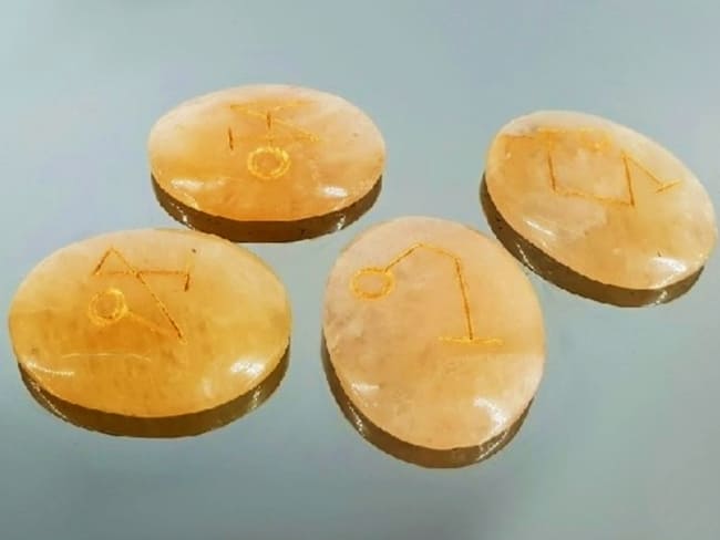 La bolsa Contiene  cuatro rodados planos que tienen grabado los símbolos de los Arcángeles Michael, Uriel, Gabriel y Raphael ; tallados en relieve y en un color dorado.