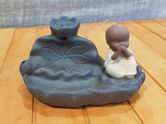 Quemador inciensario Conos pequeño Buda . Realizado en resina y pintado artesanalmente, ideal para quemar conos de reflujo. De 6,5cm de alto por 12cm de ancho.
